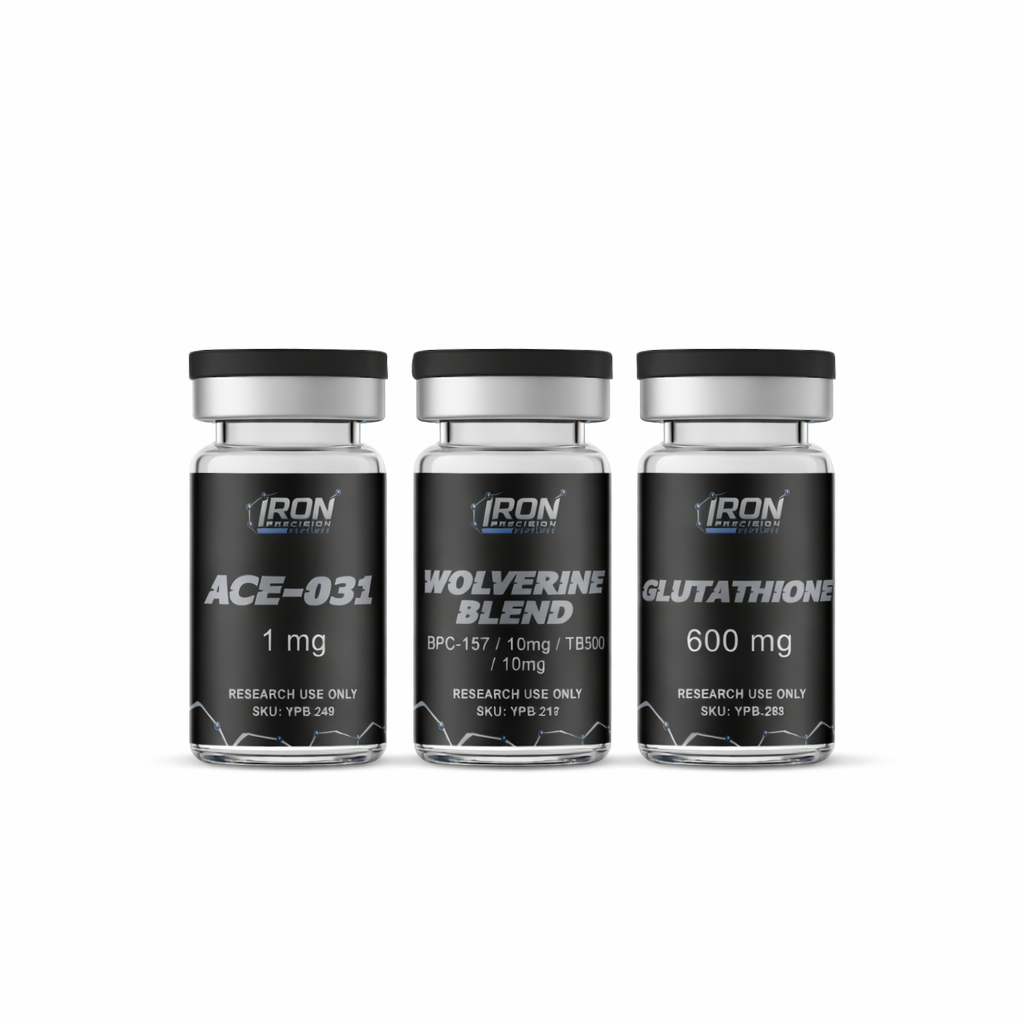 This curated kit pairs three complementary research materials—ACE-031 (1 mg), Wolverine Blend, and Glutathione (600 mg)—for investigators conducting in-vitro binding assays, protein stability studies, and redox chemistry modeling.